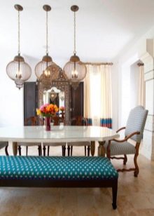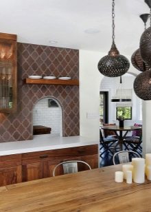 Chandeliers in the Moorish style are metal structures decorated with glass and crystals. You can choose not only one main light source, but also complement it with spectacular sconces. Due to the mosaic inserts and crystals, light creates interesting patterns on the walls, so the lighting gives a mysterious atmosphere.