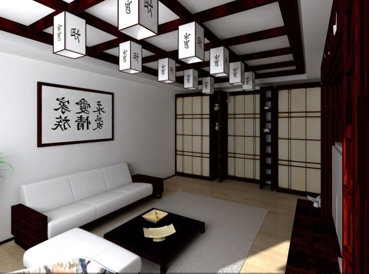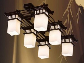 Japanese-style chandeliers are a triumph of minimalism. They are very concise, with strict forms and standard colors.As a rule, such lamps have a fairly clear form - these are either rectangles or squares. The color scheme is mainly classical - a combination of white and black, brown with beige or white with red. One lamp rarely combines more than three shades.