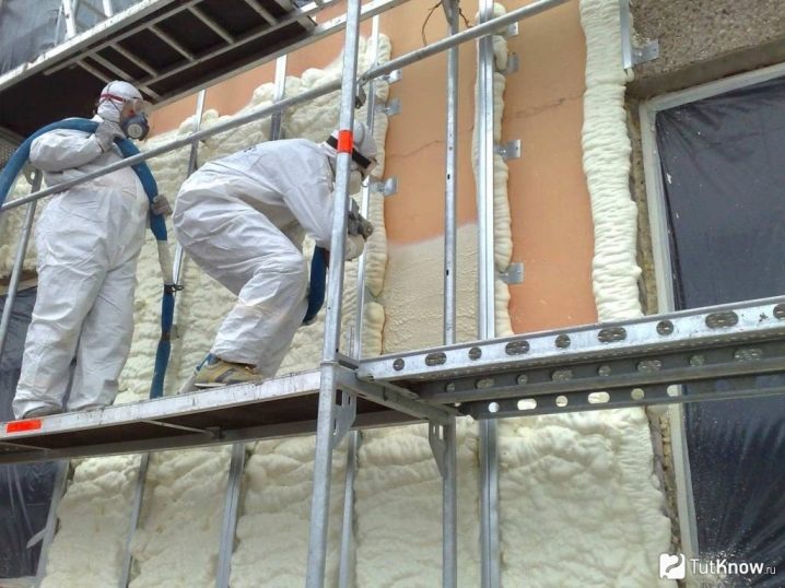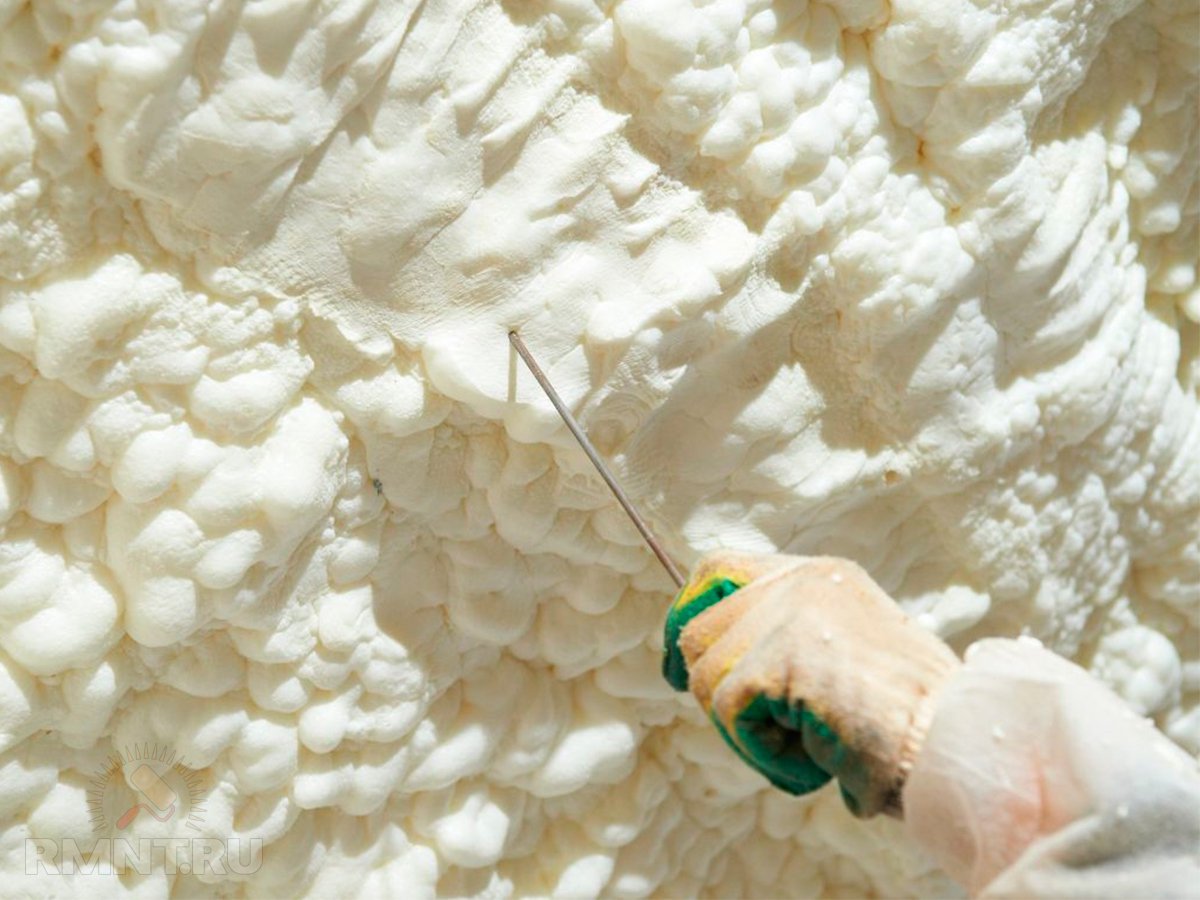 Sprayed products are applied to the working surface, where the process of foaming occurs during the chemical reaction of the constituent components of foam and air. The resulting substance increases in size to the required volume, after which the process of solidification of the insulating composition takes place.