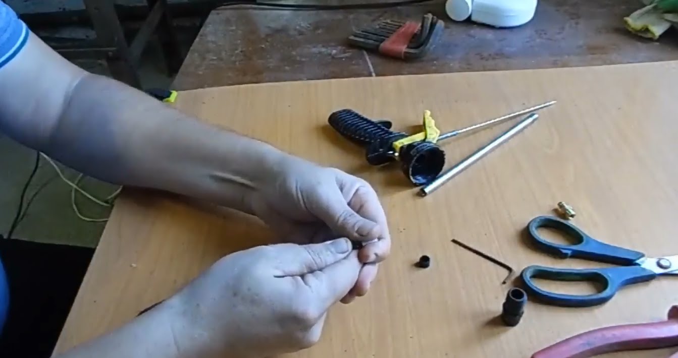 The following method of cleaning is used if the barrel of the gun is completely clogged, and the adjustment lever (trigger) is not pressed. In this case, you must carefully clean the nozzle from the foam material and lubricate it with a solvent. The barrel must be omitted. After a few minutes, the lever should start moving. If this happens, you can continue the subsequent cleaning.