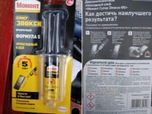 The next model is "Super Epoxy Formula 1". This adhesive mass provides ultra-fast bonding of products consisting of any materials. This composition is sold in a package that is produced in the form of a syringe with a special nozzle-mixer. This allows you to properly dose the substance and evenly cover them with material.