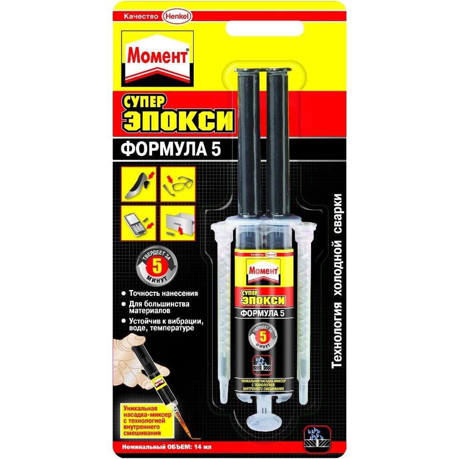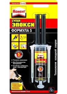 Sample "Super Epoxy Formula 5" Today is also often used in construction works. Like the previous model, this glue is produced in a special syringe with a nozzle-mixer, which allows you to easily mix the components of the composition. This substance hardens completely within 5 minutes.And after 8 hours it can even be drilled and ground if necessary.