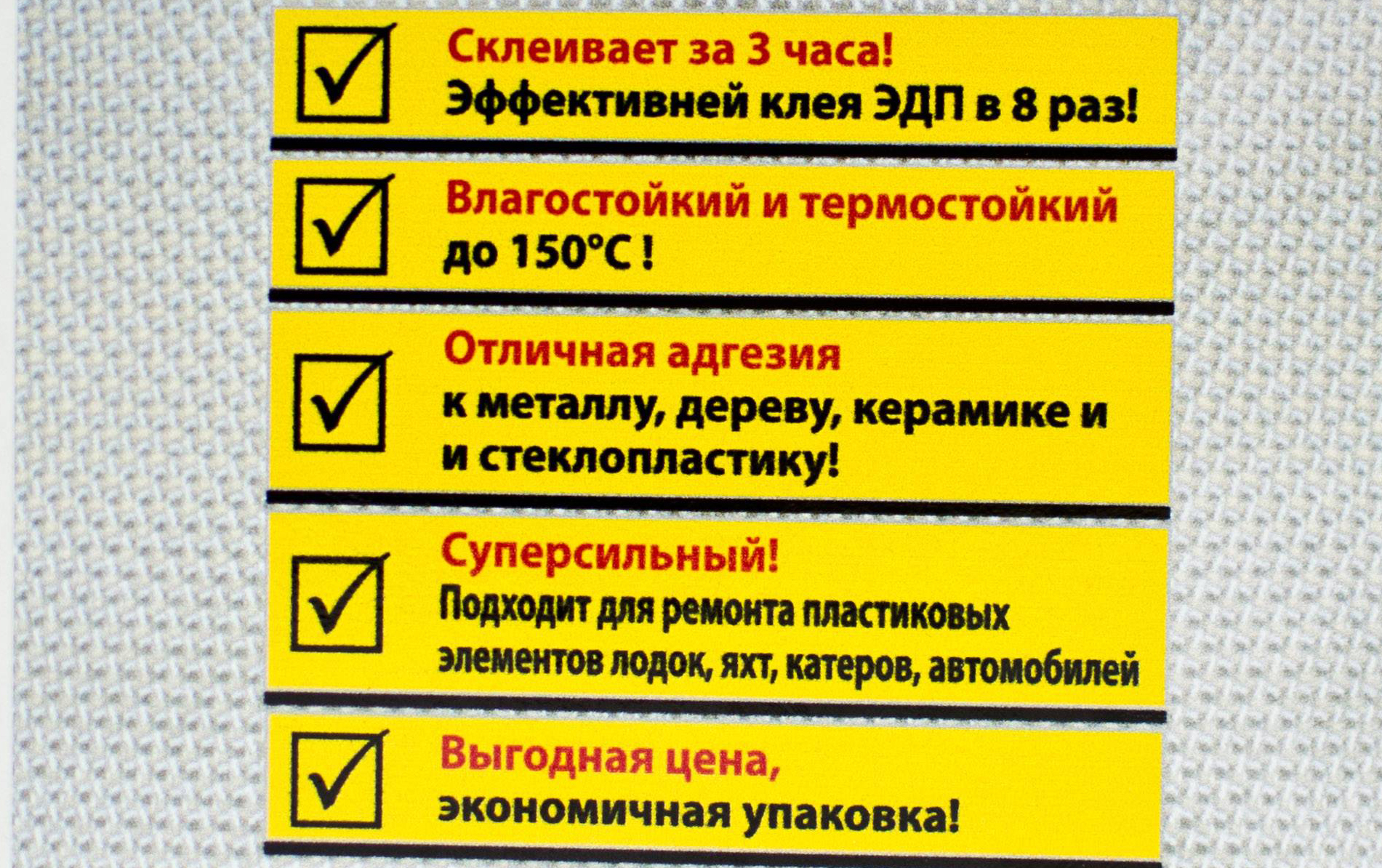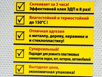 EDP is another popular brand of epoxy, which is used to work with a variety of surfaces: from porcelain to metal. Consumer reviews clearly distinguish this type of glue as optimal, in terms of price - quality, and versatile in terms of scope. This glue has been used in everyday life, as well as for the repair of automotive equipment, the elimination of cracks in all types of plumbing, modeling and the like.