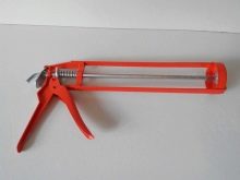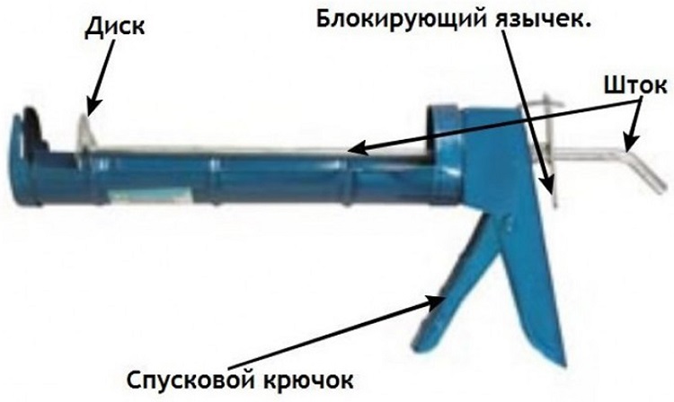 Skeletal gun for applying sealants is most popular. It is a construction of metal ribs, stem and handles, tubes of 310 ml are inserted into it. Such a pistol holds the tuba more securely than a semi-corpus.