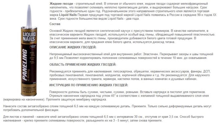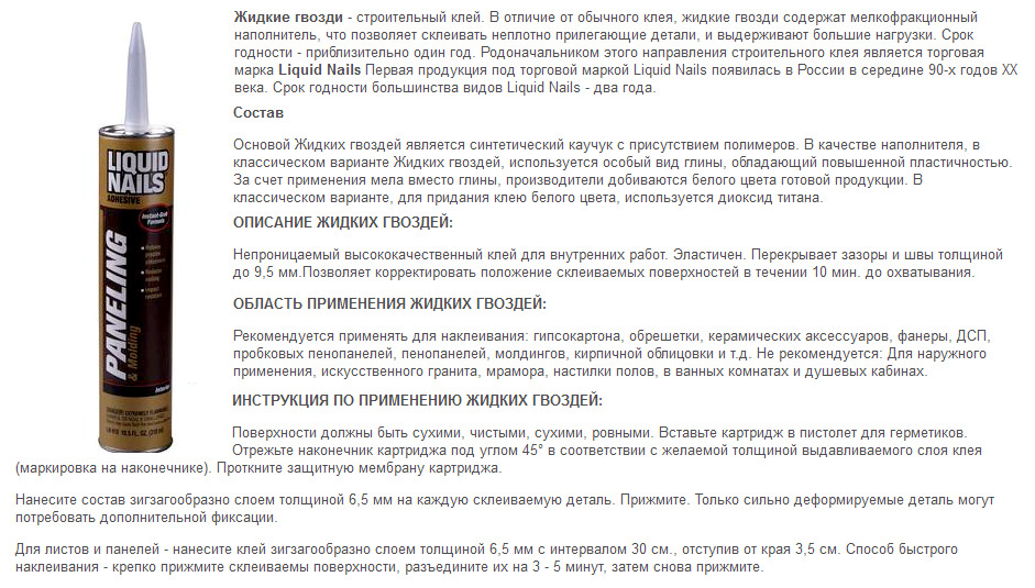 The substance that will be discussed is a construction glue with a very strong mount. It differs from the usual mounting adhesive non-standard composition. In addition to synthetic rubber and polymers, liquid nails contain fine abrasive grains, which give the bond strength, comparable to using ordinary nails.
