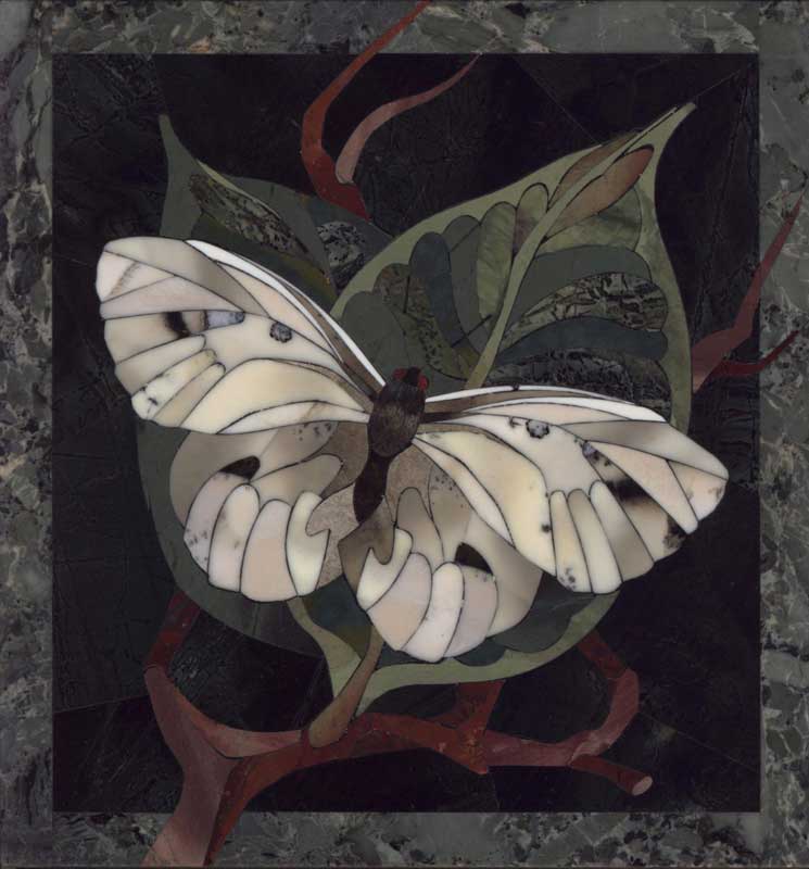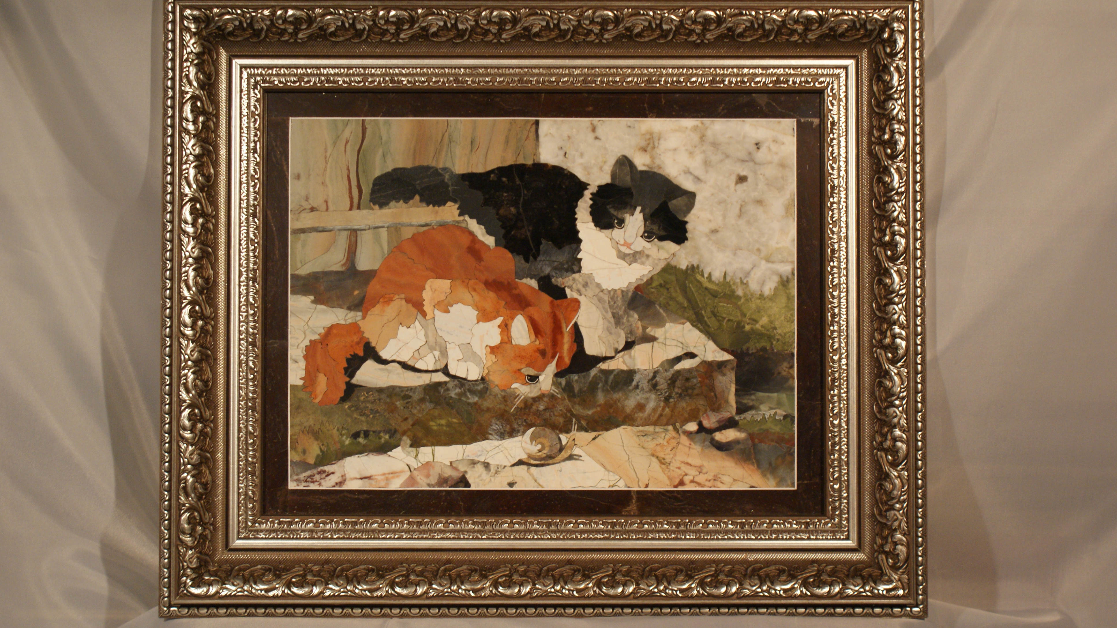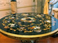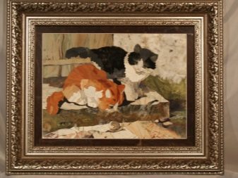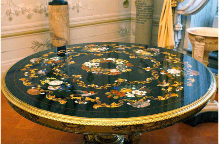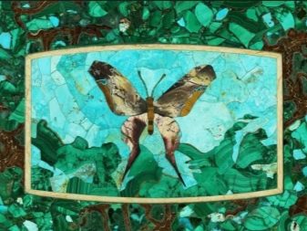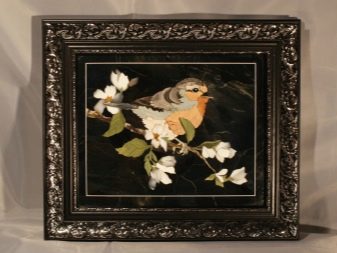 Classic usage example: dark marble for background in combination with jasper, amethyst, turquoise will create the desired contrast. Elements become brighter on the black plane. Traces on stones (strokes, stains, stains) are the basis of this technique. The secret of the masters in changing the shade of the working tool is the effect of temperature. Heated marble gets delicate pink gamut, chalcedony becomes brighter after heating. For the work they select plates that mimic the foliage of the veined trees, and for the depiction of animals, a stone with a pattern of villi.
