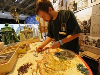 On the prepared items make markup and cut parts on the machine. The thickness of the finished plates reaches 2-3 mm. Refinement of parts occurs on the machine for grinding parts. Reverse method for assembling paintings - laying elements face down using stencils. The assembled base is fixed with glue from the seamy side. This method is used for bulk work. The final touch is the grinding of the finished surface.