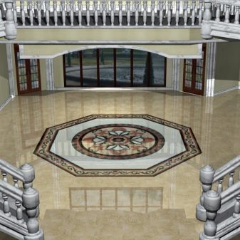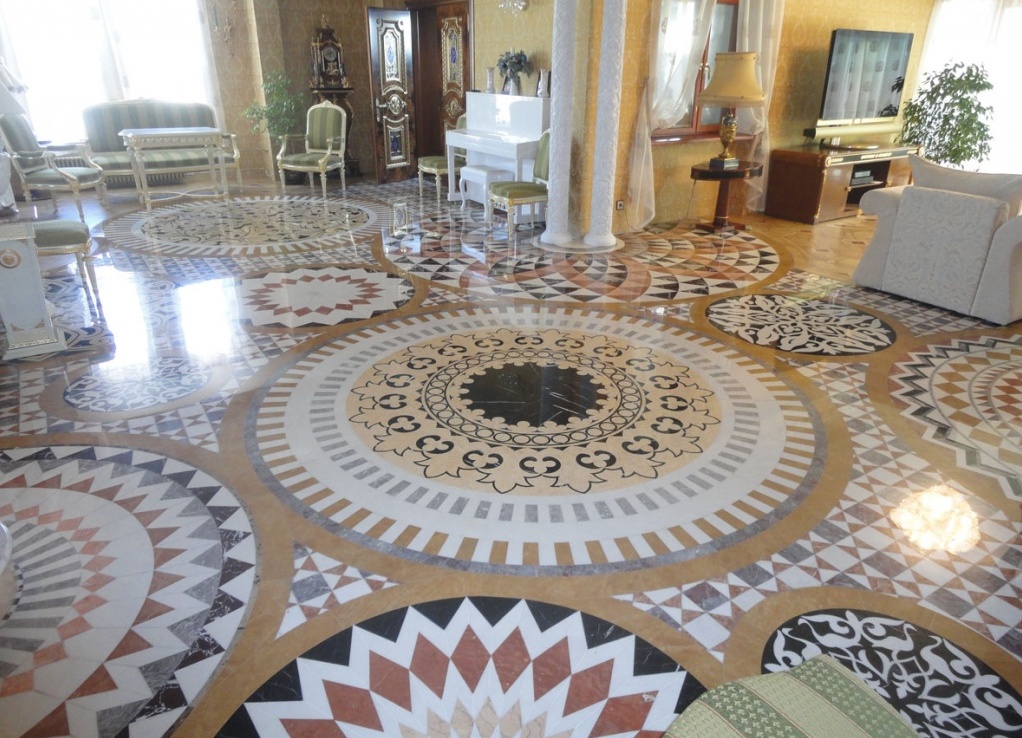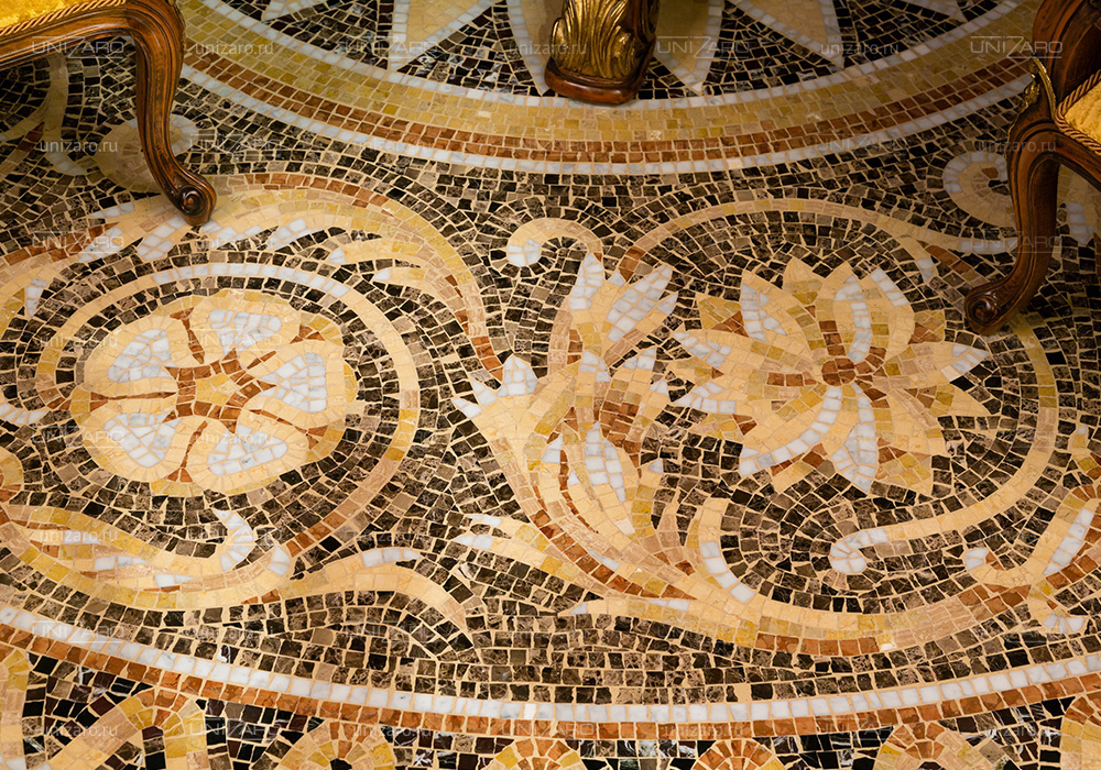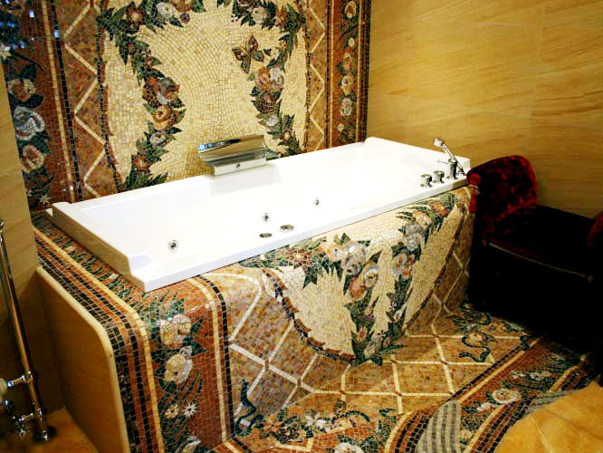 Florentine mosaic in the interior is used by people with high status. This design can be found in the decoration of the bathroom, swimming pool and household items, it emphasizes the presence of taste.