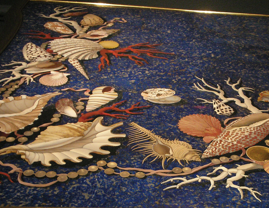Commesso is the second name of the Florentine mosaic. This is a technique of creating paintings with thin pieces of bright colored semi-precious stones, developed in Florence at the end of the 16th century. Most common stones for its production are agate, quartz, chalcedony, jasper, granite, porphyry, lapis lazuli. The commesso design for worktops and small wall panels varies from symbolic colors to landscapes. The work is done with painstaking care and sensitivity to the artistic object.