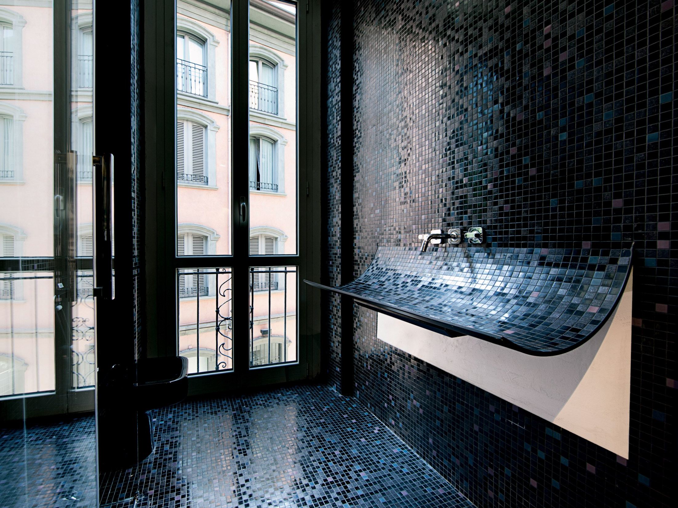 - Bisazza Glass is also used as a base material. In addition to standard surface cladding projects,they offer an exclusive collection of Bisazza Home (furniture and decorative items decorated with mosaic patterns made of precious materials) and the line of production and sale of personalized tiles for the decoration of bathrooms and basins Bisazza Bagno.