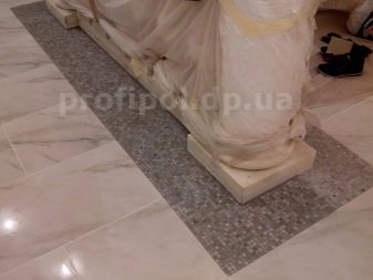 - Sphere of use. An extensive scope is another advantage. Elements of marble mosaic spread on vertical and horizontal surfaces. Using natural stone, you can select a part of the building or a separate element in the room (stairs, fireplace, partition, arch, doorway). For mosaic there is a place in residential buildings (private houses, apartments, cottages) and public spaces (hotels, restaurants, boutiques).