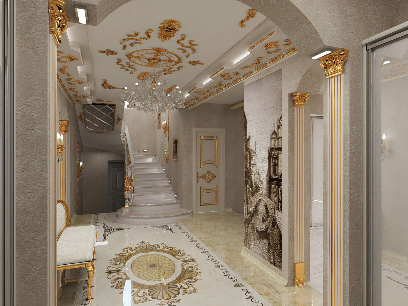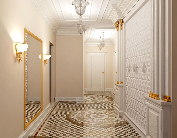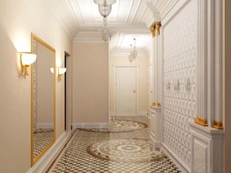In the spacious hallway mosaic panels will look perfect. Spectacular decor will create the necessary impression about the design of the whole house. In this part of the house it is recommended to decorate the floor. Due to its practicality and durability, the stone will retain its beauty even in high-traffic conditions. If the room has a large wall mirror, you can focus on it with an expressive mosaic.