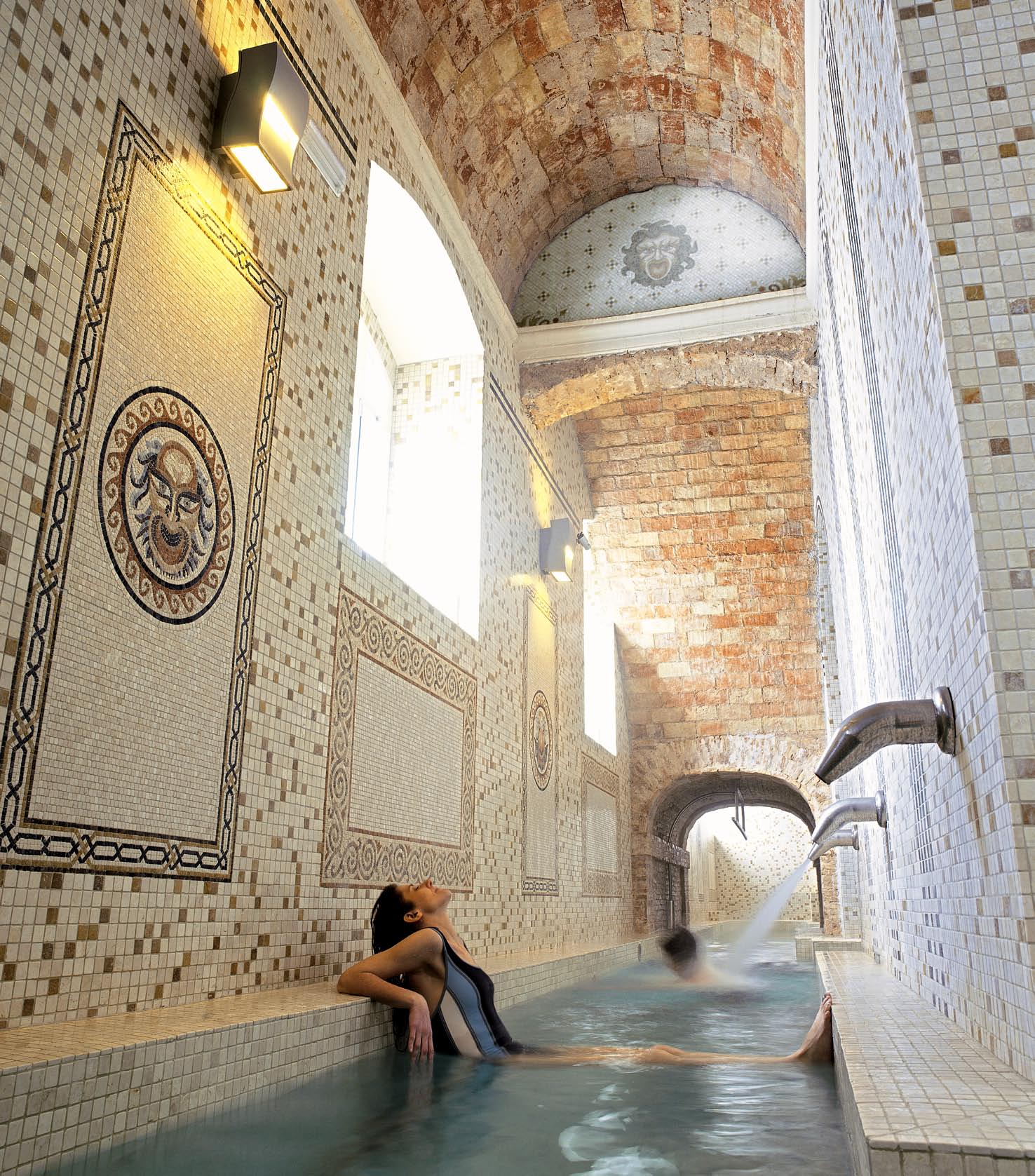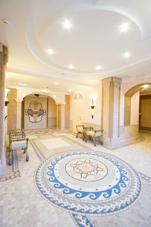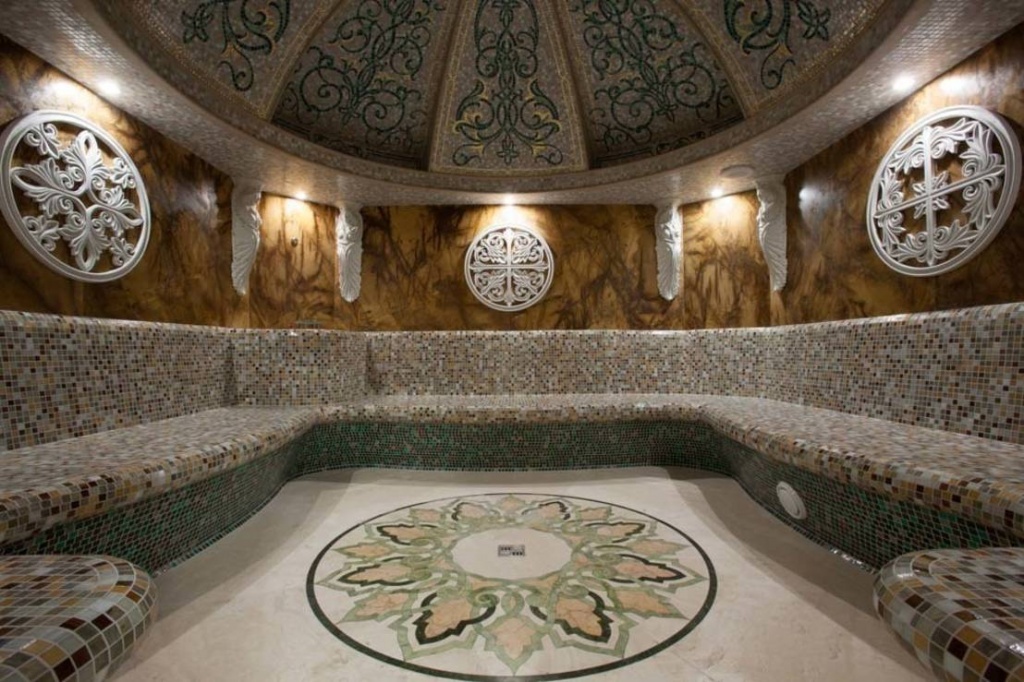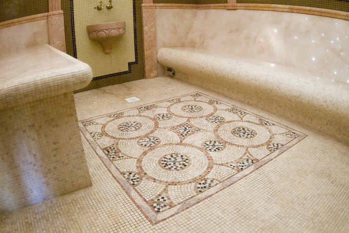 - Spectacular and expressive finish hamam made of natural stone. Marble is used to finish the benches and create an artistic composition on the floor.