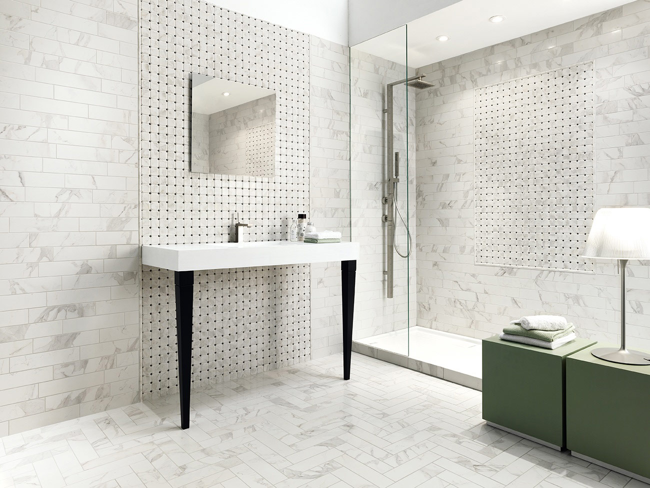 - Marble mosaic panel taming the wall in the bathroom. Stylish and practical.