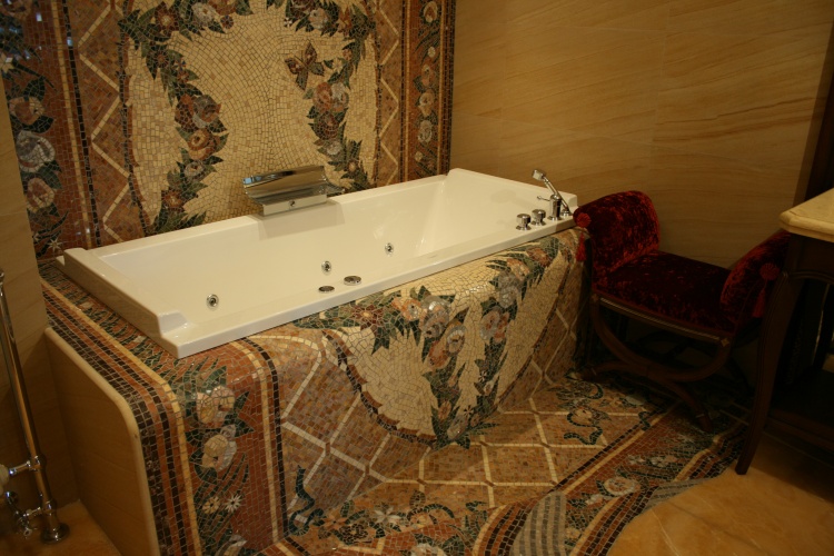 On the basis of residential premises, marble mosaics most often decorate bathrooms, as well as, pools and saunas (if available). The size of the panel can be different (from a large picture of a variety of elements to the border). The cost of the wizard depends on the complexity of the work. The wear resistance of the material to water has played an important role in the popularity of mosaic.
