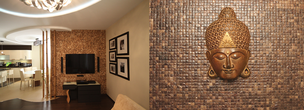 - Coconut. This option is made from coconut skins. It has a slightly convex surface. The coconut mosaic does not burn, it washes well, has excellent sound insulation properties and retains heat.