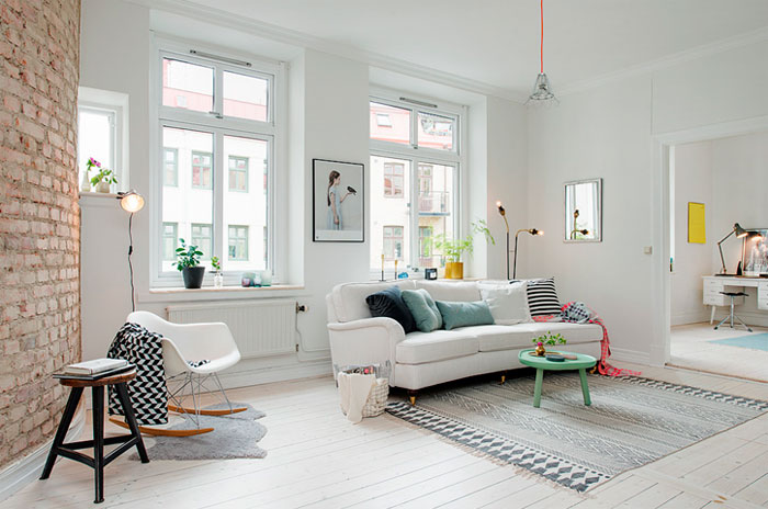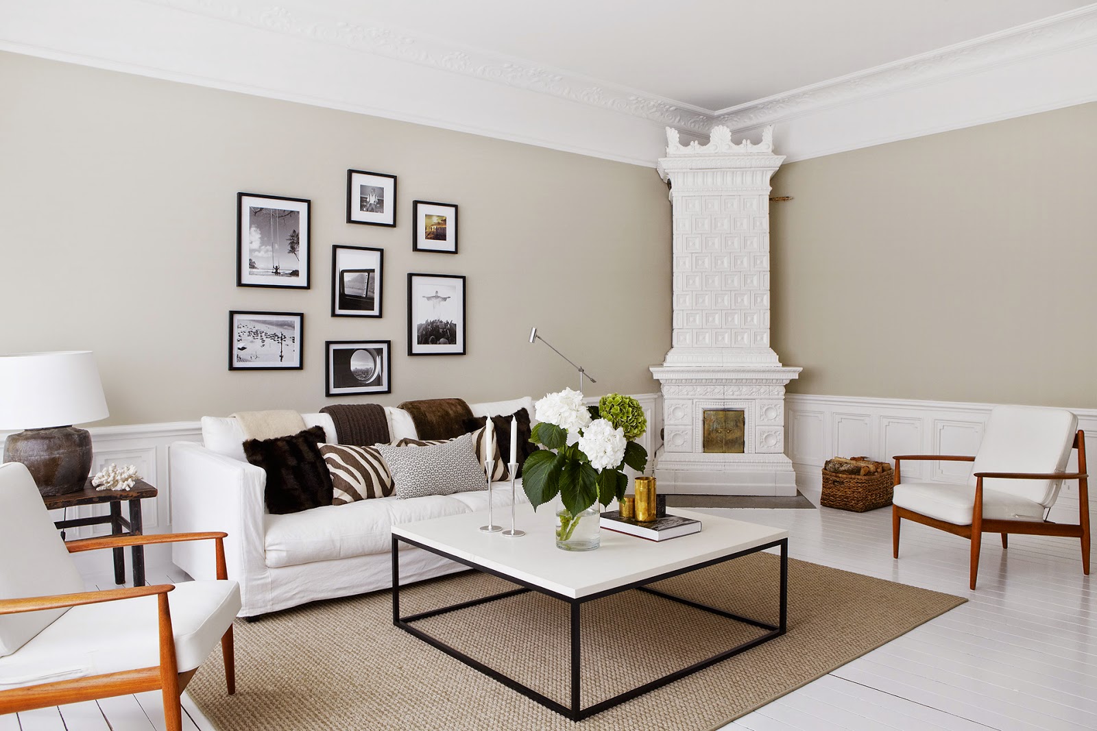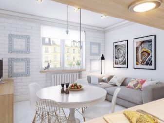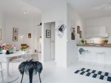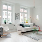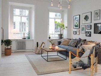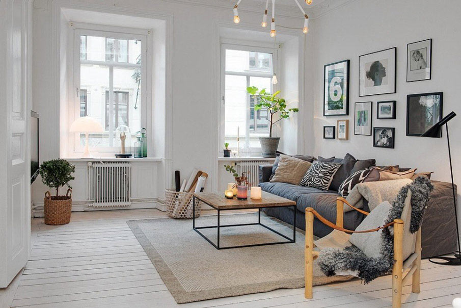 Scandinavian style also welcomes snow-white flooring.Low-key gamma, including different shades of beige and brown, adds to the atmosphere of warmth. Photos on the wall emphasize the individuality of the interior.