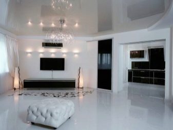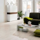 The snow-white floor in the hall can be its main decoration. Luxury glossy coating you can highlight leather sofas, elements of chromed metal and glass. Matte wooden floor can be effectively shaded carpet or soft furniture in soothing colors. Here both gentle tones, and expressive contrasts will be pertinent.