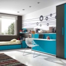 Another example of a room design in an ultra-modern design. Here a strict black and white gamma is diluted with bright turquoise elements.