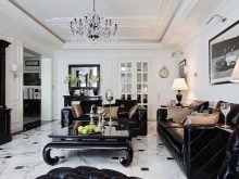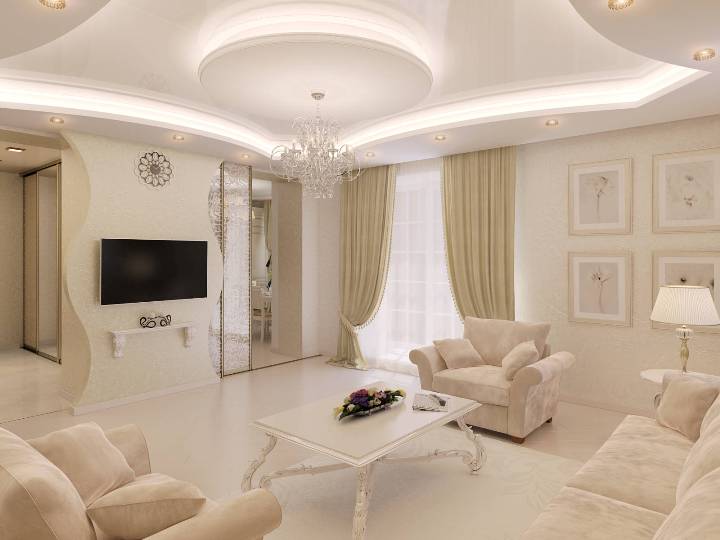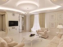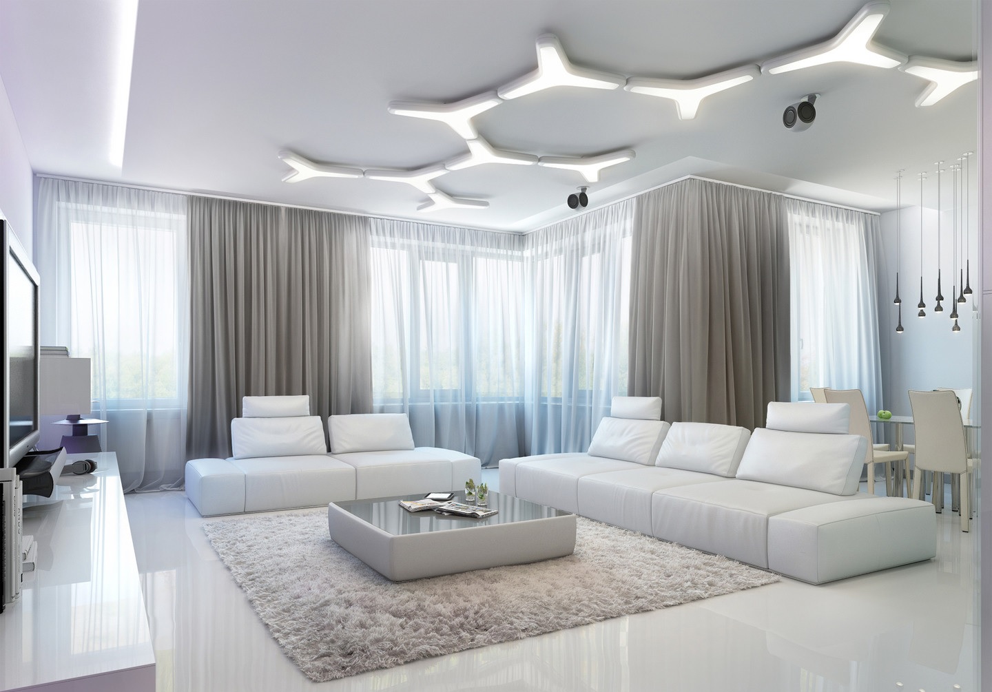 White color is ideal for a living room decorated in a contemporary style. Upholstered furniture and a table of concise design emphasize the atmosphere of minimalism. Futuristic lamps make the interior almost "cosmic". Home comfort adds air curtains of a coffee shade and a carpet with thick soft nap.