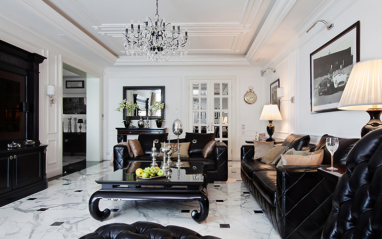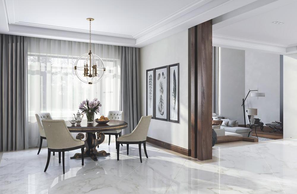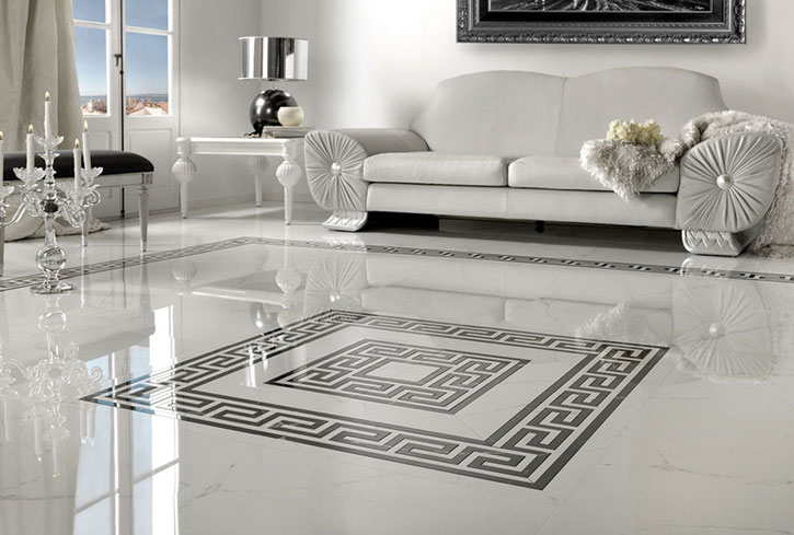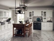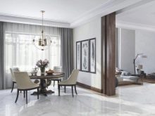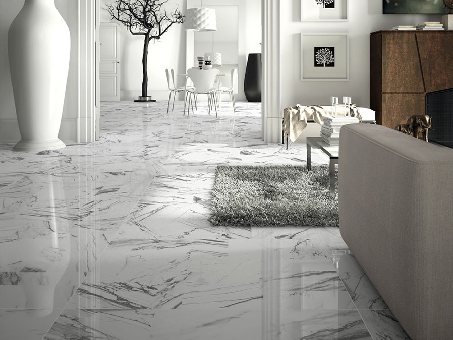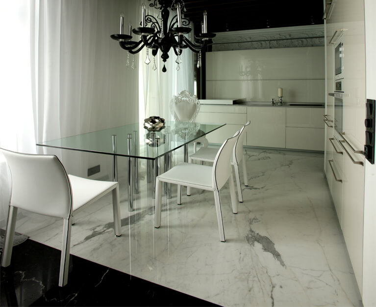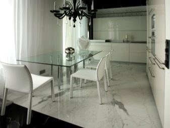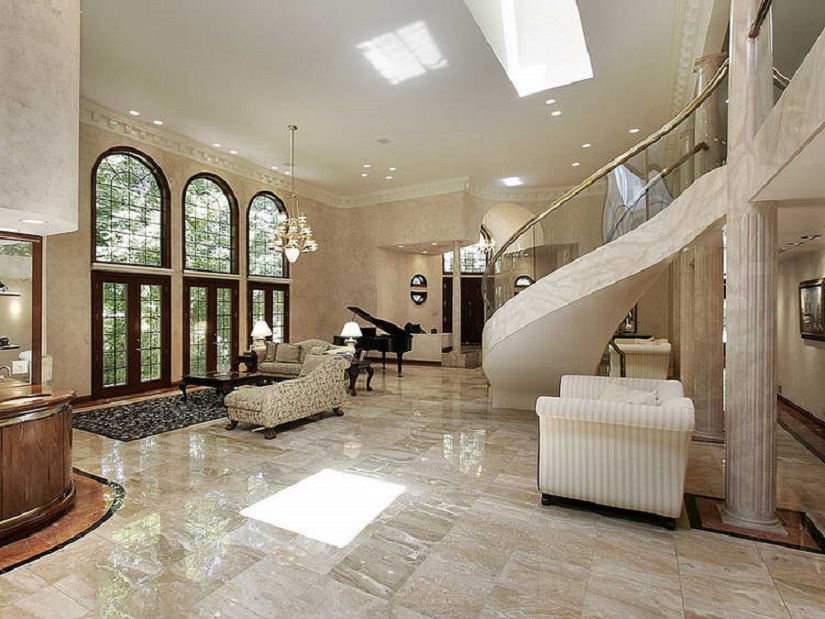 Real marble floors are rarely used in city apartments.However, in large country houses they are not uncommon. White marble looks status and noble. It is resistant to abrasion, moisture and temperature changes, is highly durable and durable.