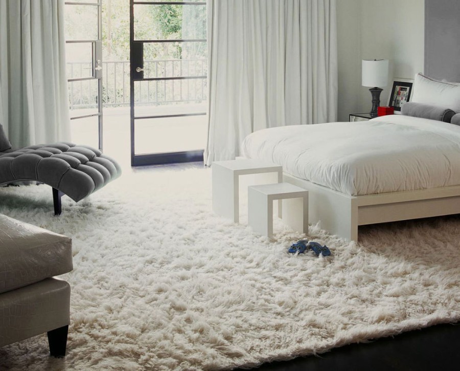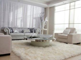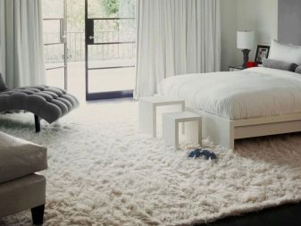 If you want more home comfort and warmth, you can decorate the floor with a fluffy carpet to match the color of the floor covering. Suitable and contrasting option. You can also lay a white carpet on the floor. Velor and other materials are pleasant to the touch and attractive to look. In addition, they retain heat, which is especially important in apartments with poor heating.