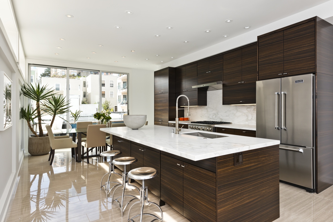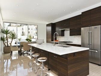 Color combinations are also unlimited. A bright kitchen suite will make the room elegant, a dark one will add severity, and a bright one will bring a cheerful and positive mood to the atmosphere.