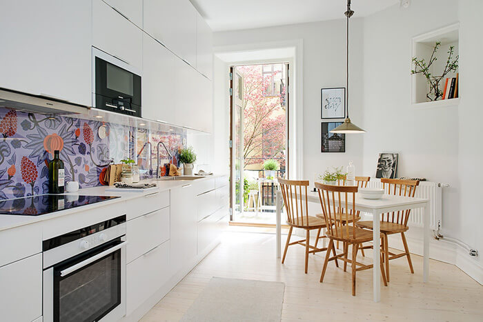 White kitchen can also be attractive and cozy. Upholstered sofa, colorful pillows and panels on the walls give the room an original look. Imitation brickwork - another proof of how the texture changes the perception of color.