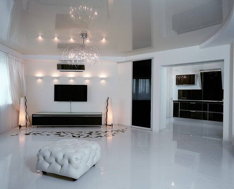 In the modern setting look great tile and porcelain. However, the white gloss is not only suitable for the techno and hi-tech stylistics. It will perfectly fit into an elegant classic interior.