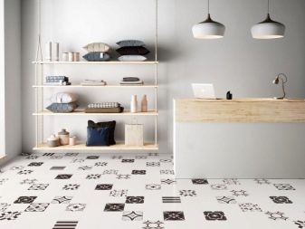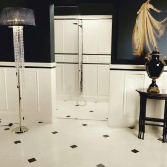 - If you have a low ceiling, the only salvation will be a white floor, which will visually make the room more spacious and bright. This technique is useful even with a small area of the room, and in poor light. At the same time, black blotches will not spoil the result. On the contrary, a well-chosen combination of tiles will create the illusion of even greater expansion of space.