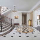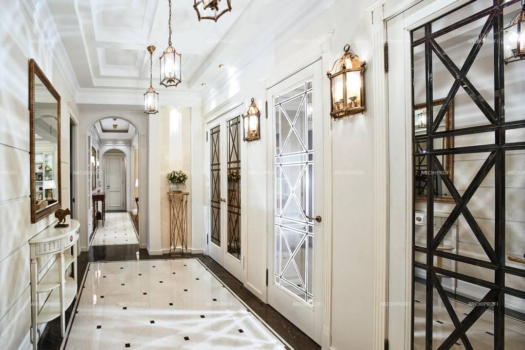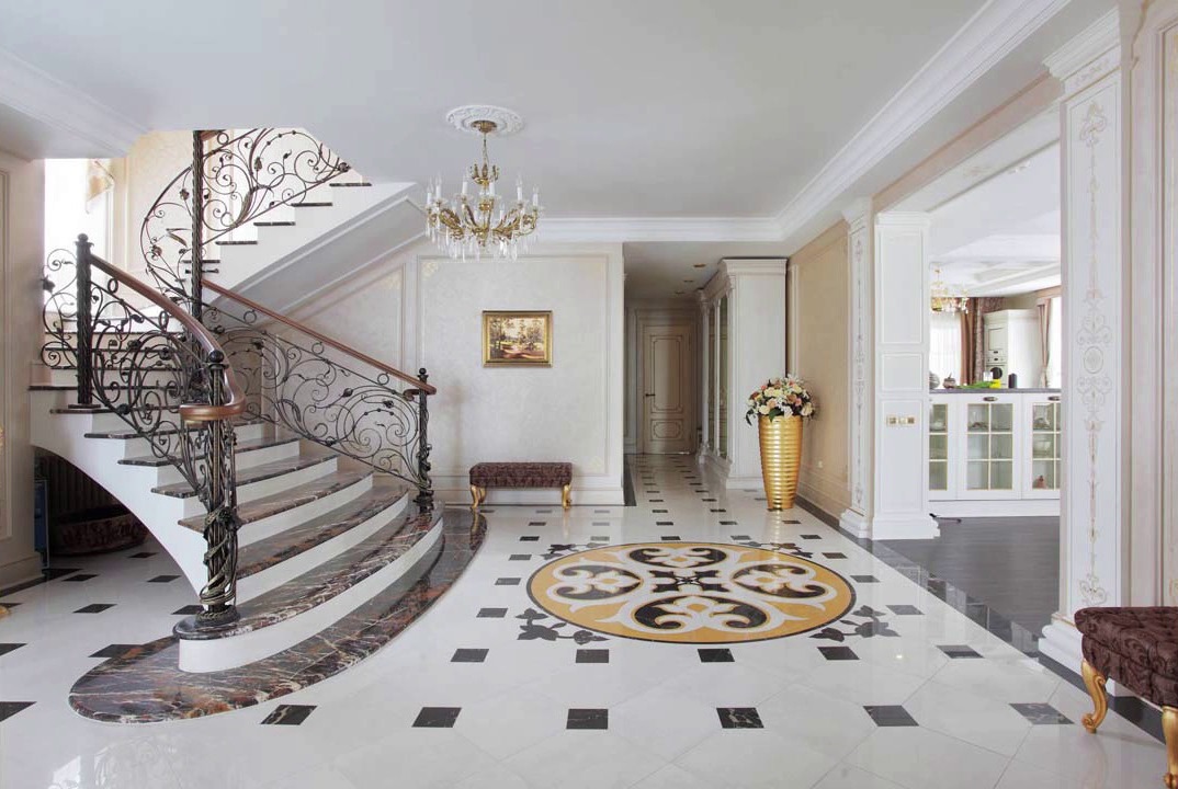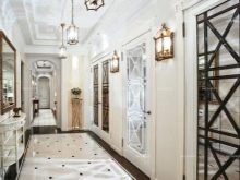 Light floor ceramics in the hall is combined with a wide variety of wall decorations, ranging from wooden panels of precious wood to simple plaster.
