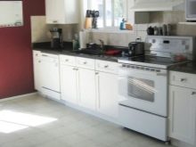 White tile is used for both the floor and the walls of the kitchen, combined with the furniture of dark and light shades. If the kitchen is not very large, then this approach is ideal for the effect of increasing space.