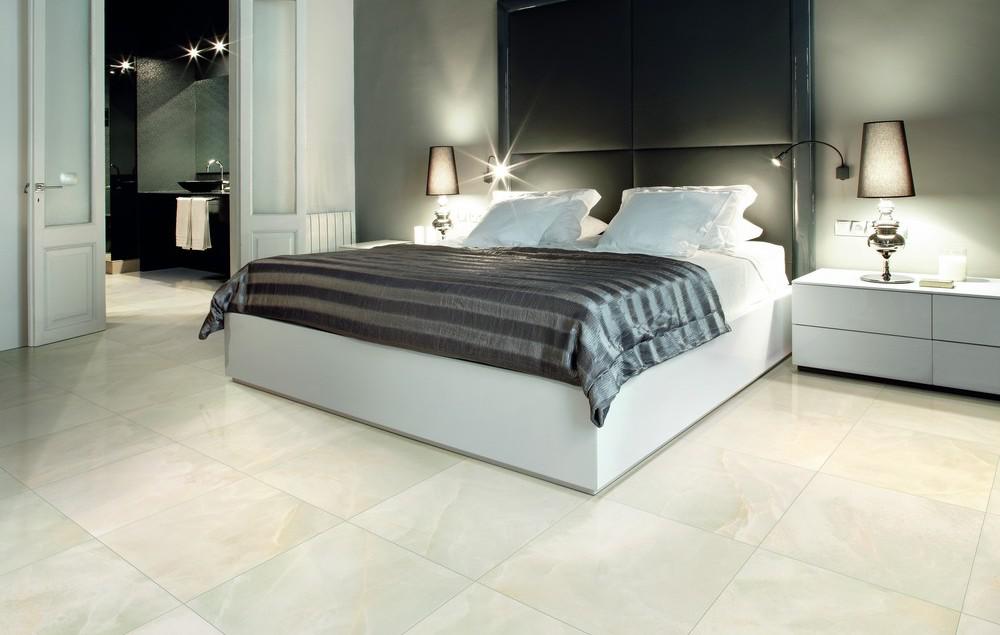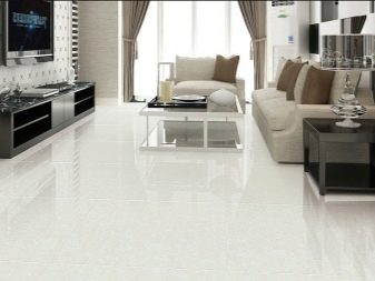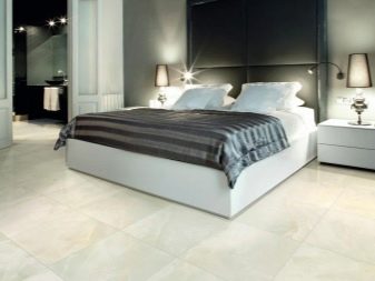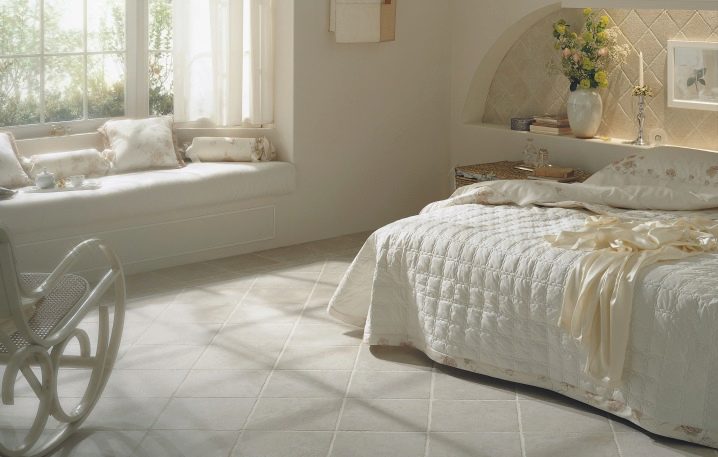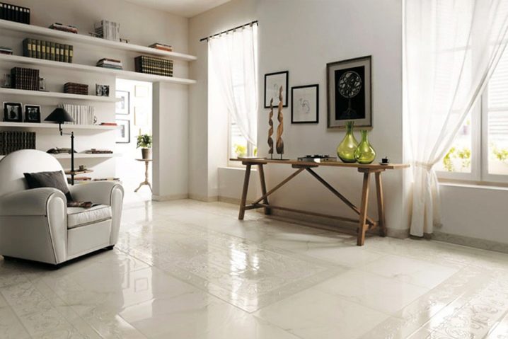 In combination with gilding, crystal chandeliers and carved mirror frames, white floor tiles look just gorgeous. This approach is called the "Italian style" or "palace style." Bright colors and spectacular accessories, beautifully framed mirrors, an atmosphere of luxury and glamor on the background of exquisite white floor - all this will look great both in the living room and in the bedroom.