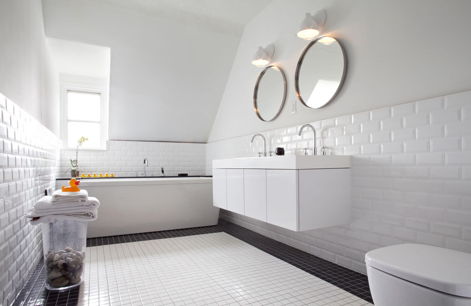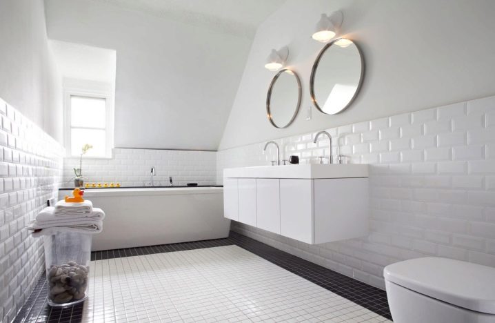 If such a room is quite large, then a perfect combination would be a combination of plots tiled in black and white and covered with plain white tiles. This technique will divert attention from the irregular shape of the room, creating a feeling of lightness, although it is more difficult to perform such finishing work than just laying even rows of tiles.