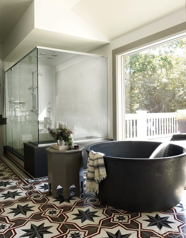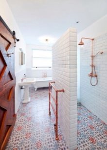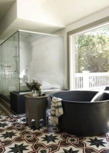In private houses, cement tiles make out not only the floor, but also the walls in the bathroom. If while bathing to light scented candles with lavender, you can feel in Morocco. However, this number of colorful patterns to taste is not for everyone. If you want to make a bathroom design in the Oriental style, you can decorate its walls with white tiles. The very same bath can be embedded in the opening, lined with cement tile.