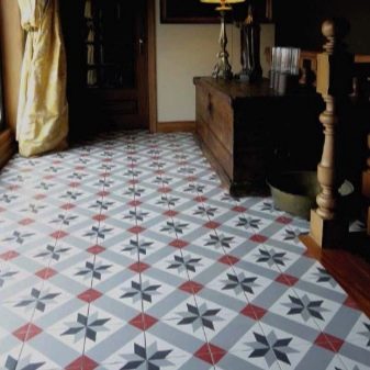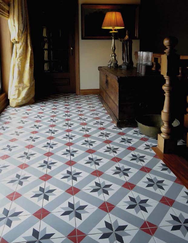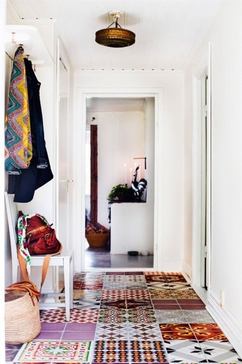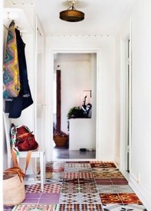 Thanks to the fashion on the Moroccan style, cement tile has become an integral partinterior of many houses. Perfectly this finish looks on the floor in the hallway in combination with a beautiful console and mirror. Vase with flowers in oriental style will be a great addition to the composition.