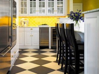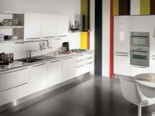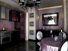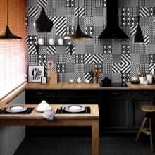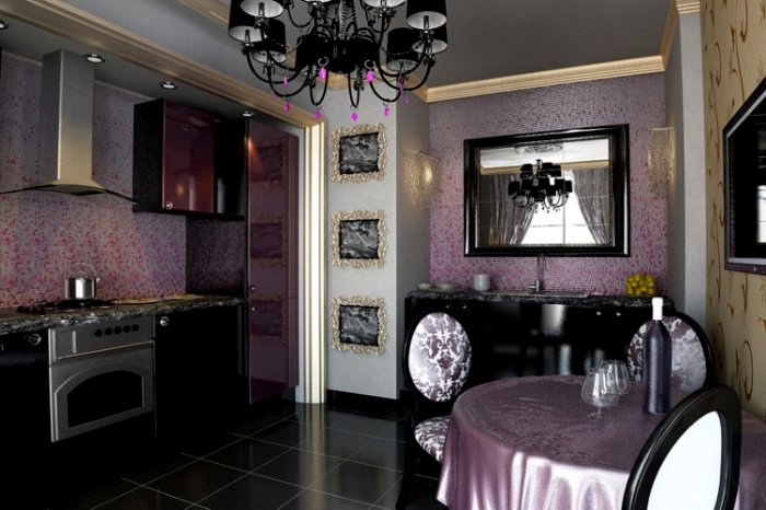 Silver or white kitchen appliances and polished furniture of the same color look good on a black background. If the floor and walls are trimmed with black tiles, then the kitchen furniture is better to choose with glass doors.