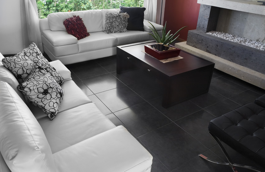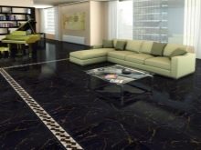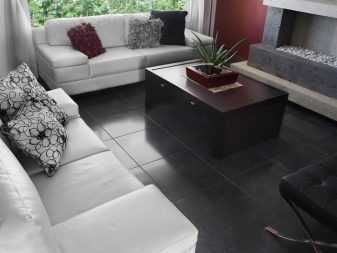 The living room, decorated with black floor tiles, will give the interior a certain status. Here the floor can have a continuous glossy finish, a “chess” design, and the presence of a large ornament. The main condition is a large area of the room. Only then will the floor look spectacular and modern.