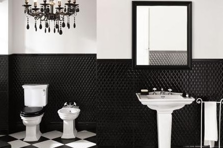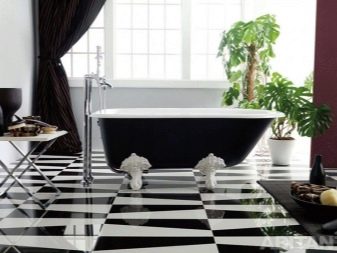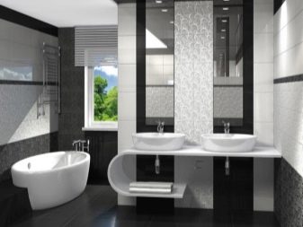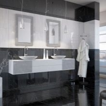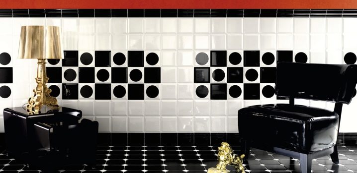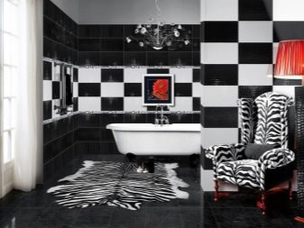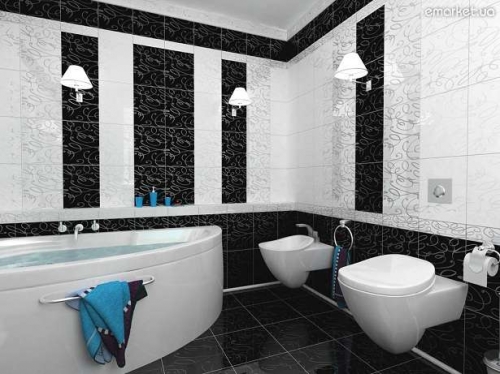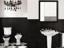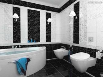 The dark floor visually narrows the space, so tiles of a different color are often added to the finish, laying it out as an ornament or in a checkerboard pattern. The walls can be laid out in black mosaic with sparkles, adding gold luxurious lamps and faience with gold details to the design.
