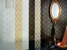 Another option is the use of a material with a textured coating.A tile with a pattern can easily get rid of monotony. It can be a floral ornament, and geometric. Tile with a longitudinal alternation of black glossy and matte strips, lined along the narrow side of the room, visually expand the room.