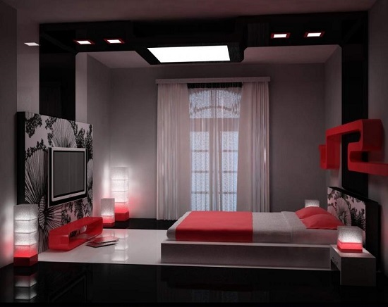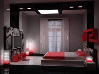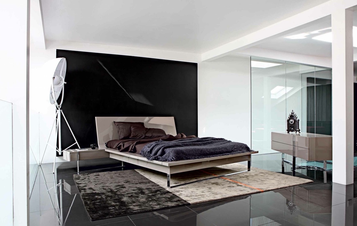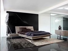 To decorate the floor in the bedroom, dark ceramic tiles are often used to impart a special atmosphere of passion. This bedroom requires an appropriate luxurious furnishings. The walls are better decorated with black fragments.