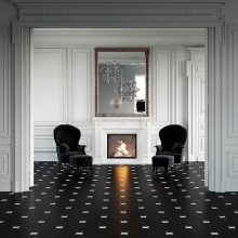 Black ceramic floor tiles can be decorated with a pattern or ornament in the form of panels. At the same time, the “pressing” effect disappears, and the bewitching beauty of the drawing attracts attention and contributes to the zoning of space.