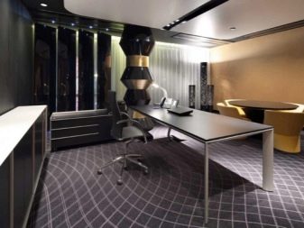 In the office, black color will create an atmosphere of seriousness and efficiency. For creative people it is better to use other tones. Offices are made in the classic proportions (an equal amount of light and dark shades). On the floor is appropriate geometric ornament or a continuous coating of textured or glossy tiles. In the offices of a large area can be zoning, combining black and tile to match the walls or furniture. You can also lay out tiles in an unusual pattern.