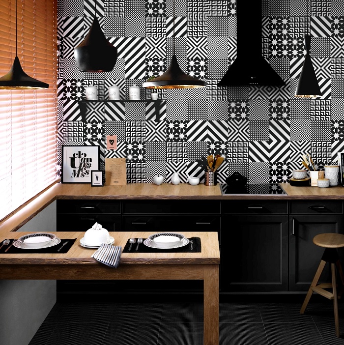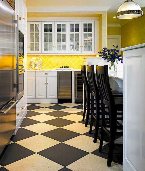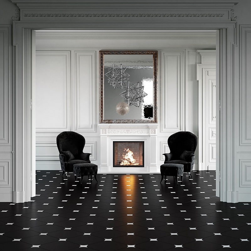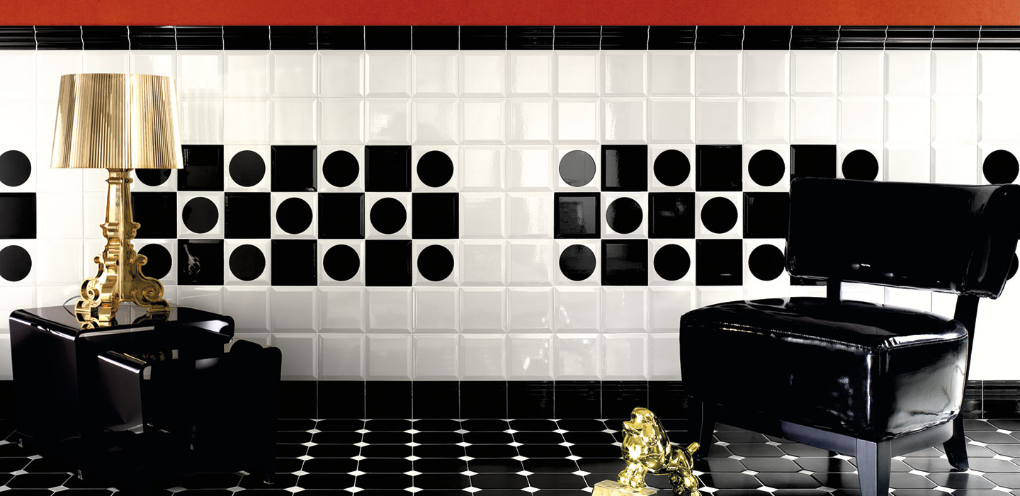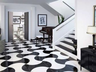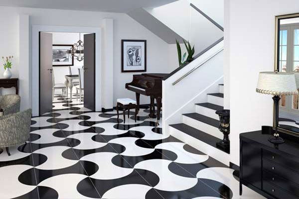 Traditionally, the alternation of black and white tiles in a checkerboard pattern. If you apply the idea of an irregular quadrilateral, you get a very effective combination. Such a pattern simulates space.
