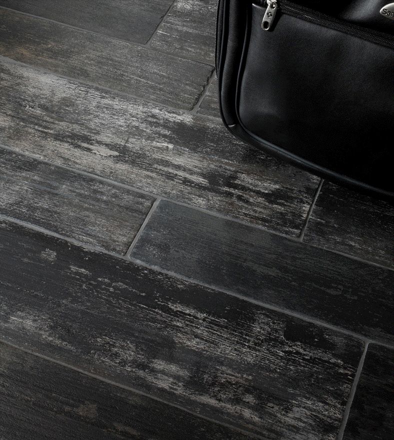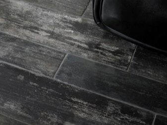 The texture of the tile surface can be stylized as a natural wood. A beautiful woody texture can create an interesting game of various dark colors on the floor. The tile under black marble with white streaks will become decoration of the most refined interior.