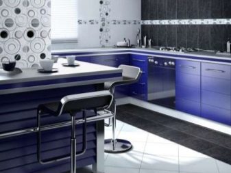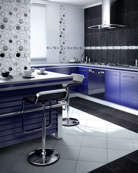 Black and white tiles with blue kitchen set and chrome parts will create a fantastic atmosphere of an alien ship.