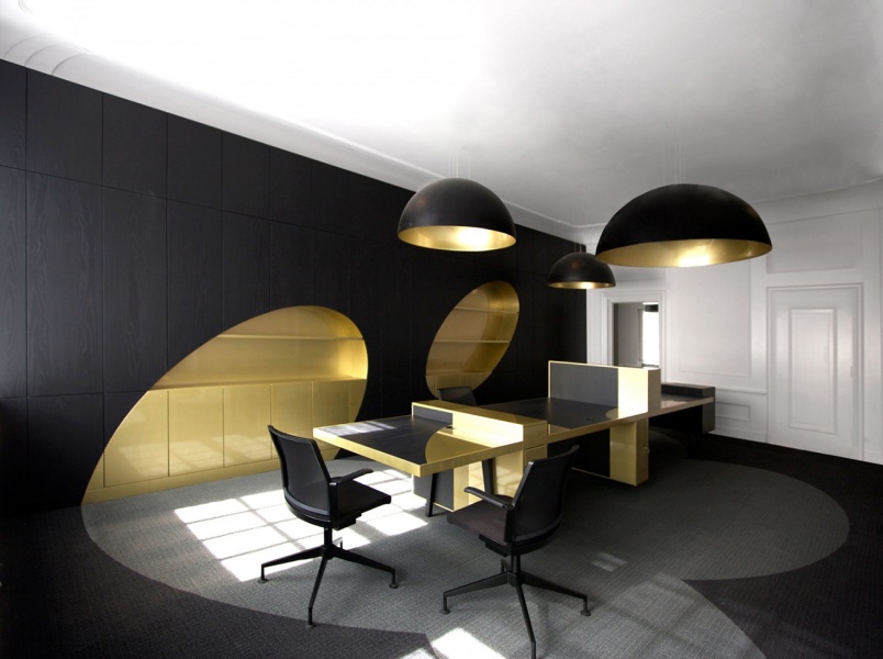 A classic combination of black, gold and white in a state-of-the-art cabinet. Drawing patterns on the floor and walls imitates lighting.