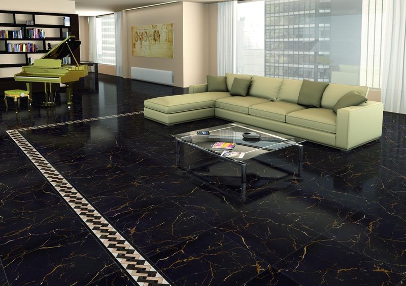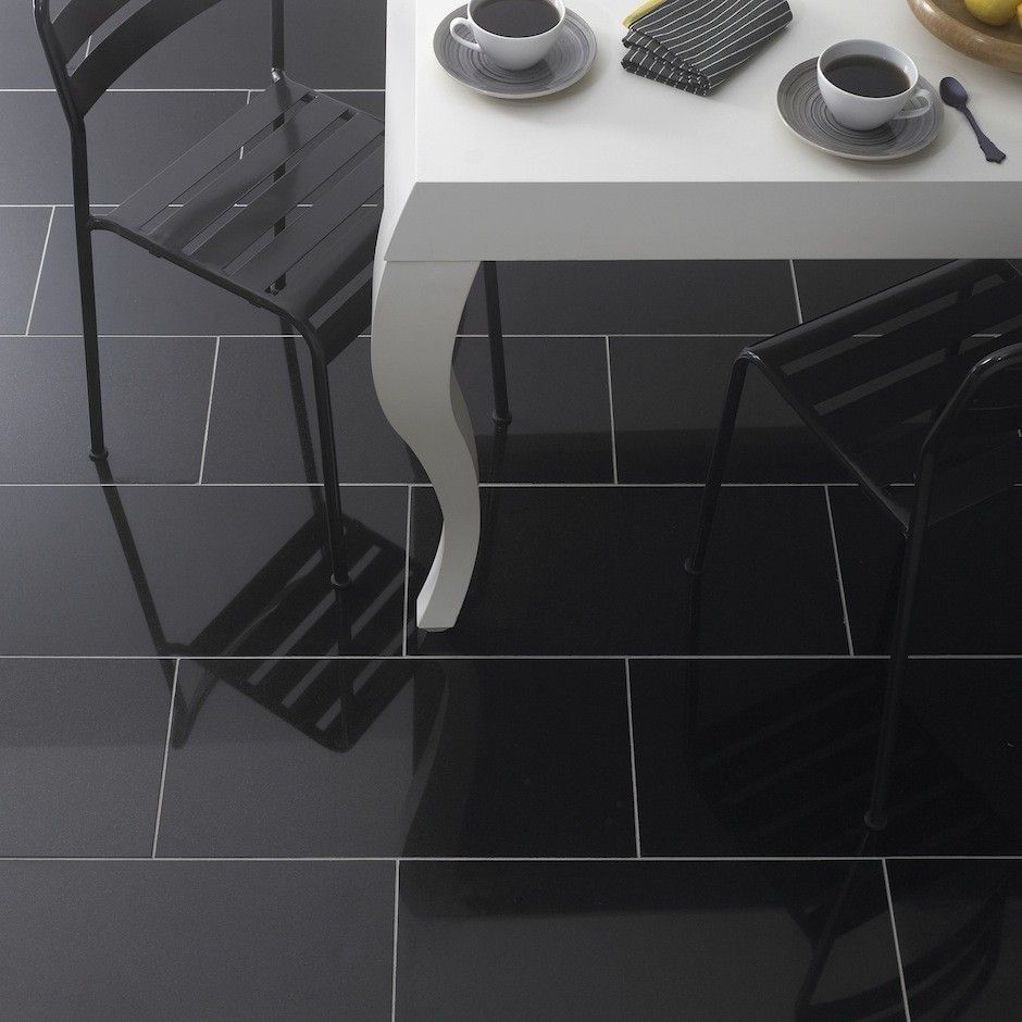 Finally, the practicality of glossy floor tiles may not meet your expectations. Black shiny surface requires more care than light. Spots and scratches on it are more noticeable than on a neutral background.