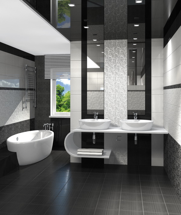 Black color requires good lighting. Otherwise, in a dim bathroom, morning procedures may seem too melancholic. For finishing choose glossy texture. Its reflective surface adds room light. On the walls, you can repeat the black motif in the form of one side, decorated with dark wall tiles, or with the help of a black pattern.
