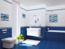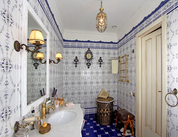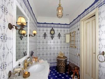- The blue tile on the floor in the bathroom is diluted with small decorative elements to match the walls, and the plinth on the ceiling echoes the color of the floor.